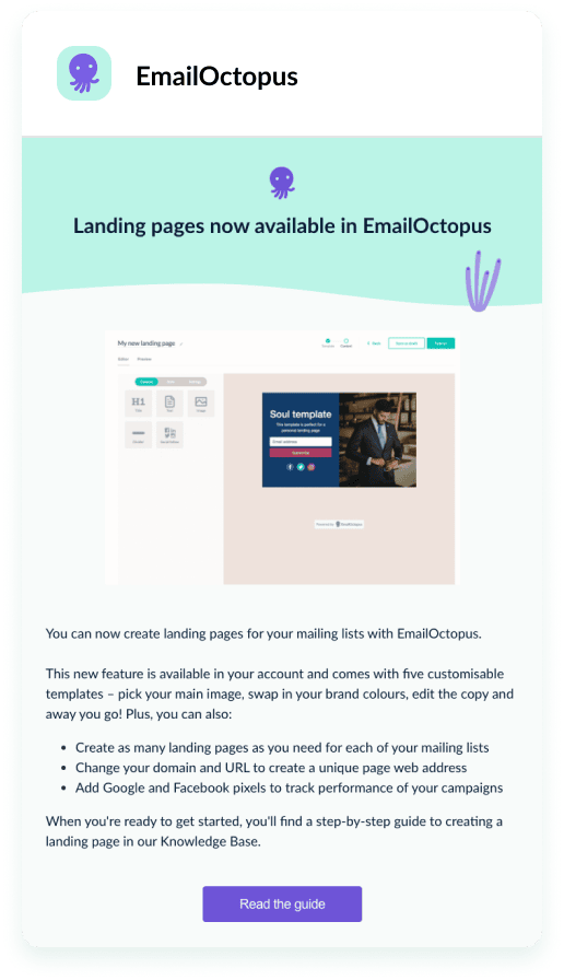 Start for free todayWith EmailOctopus you have access to a library of free email templates that you can customise in our easy to use drag-and-drop editor. This saves you the time designing emails from scratch.